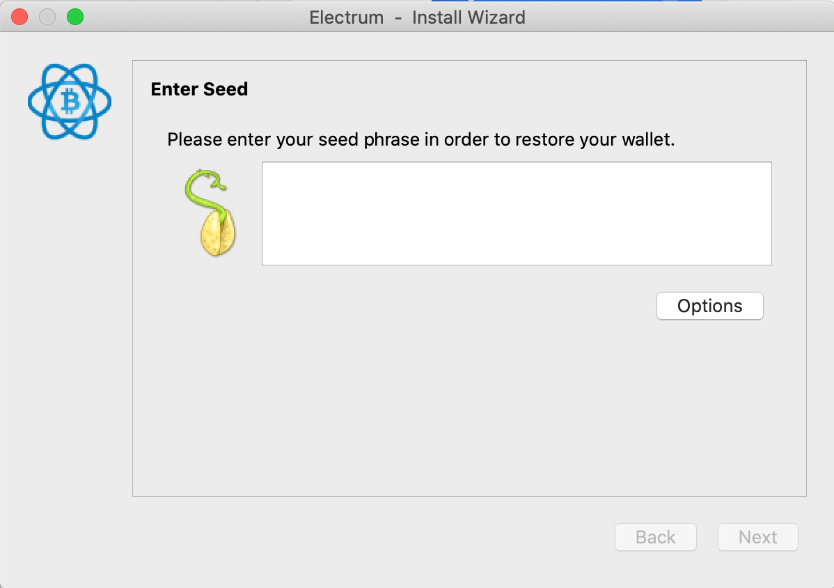 Then select “Options” and check “BIP39 seed” before continuing to select “OK” and “Next”: