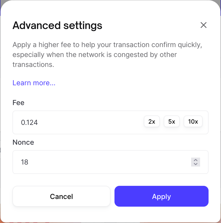 To modify the fee value, simply enter an alternative value into the field or select one of the multiplier options (2x, 5x or 10x) and select "Apply".